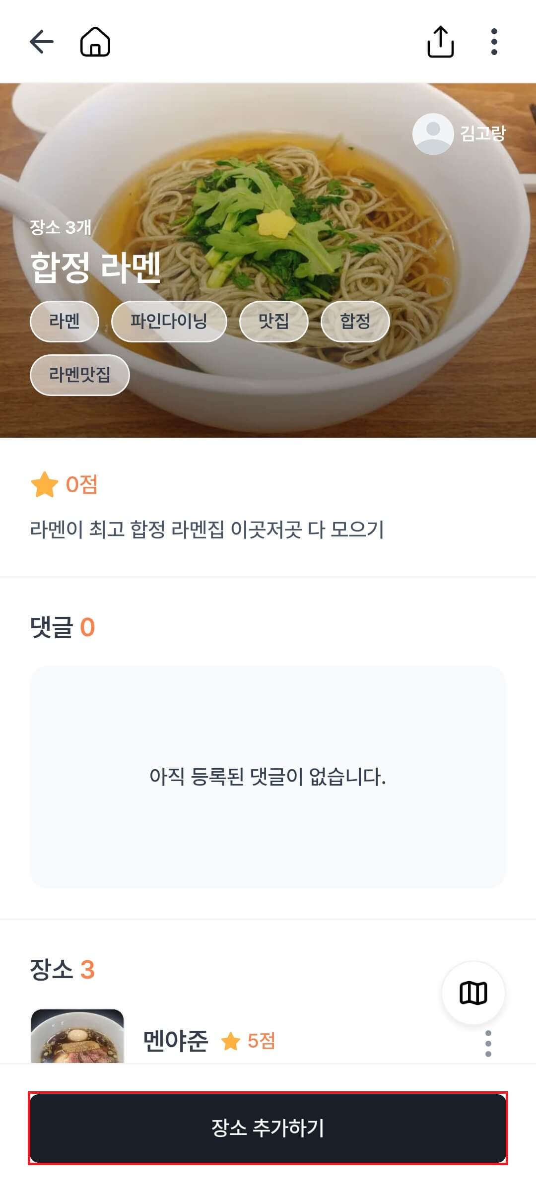 장소 추가하기를 클릭해 맛집을 검색합니다.