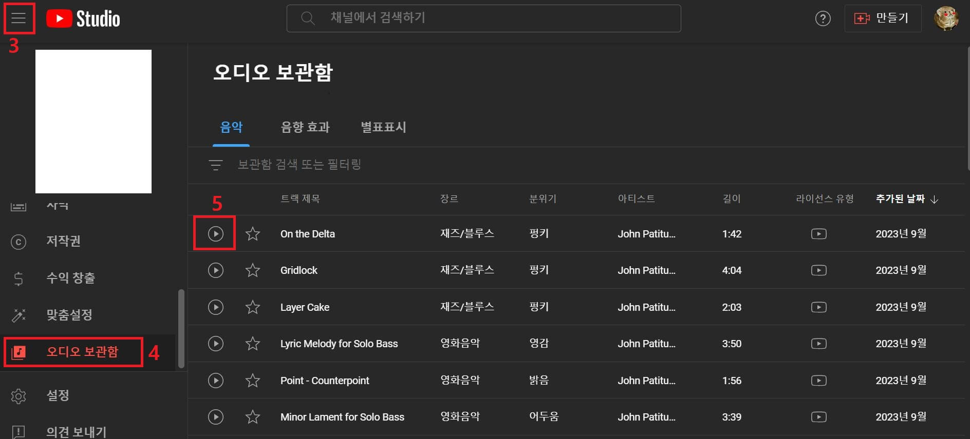 4. 아래쪽으로 스크롤 하면 오디오 보관함 메뉴를 클릭합니다.