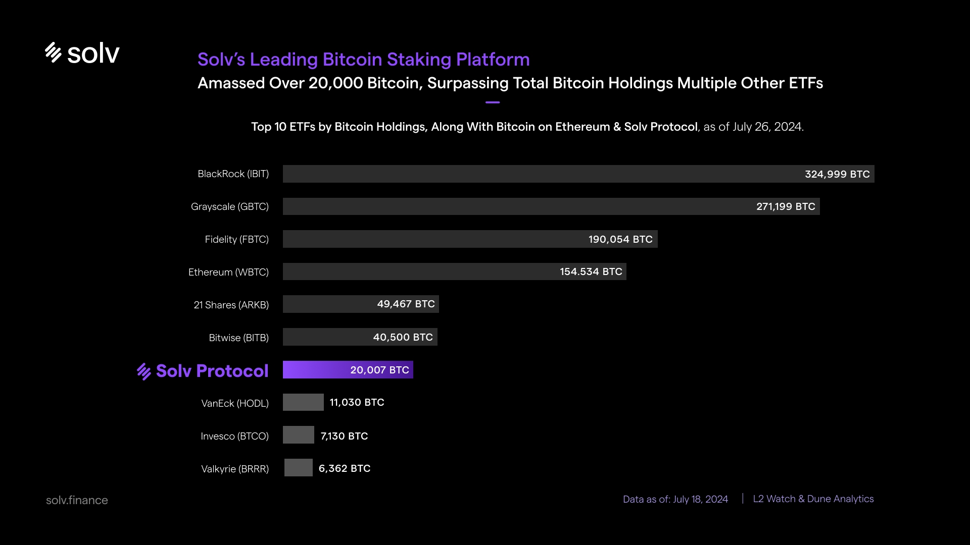 여기에서 Solv Protocol은 비트코인의 유동성 계층으로 자리매김했습니다. SolvBTC가 출시된 지 4개월도 채 되지 않아 19,000개가 넘는 비트코인이 Solv에 스테이킹되었으며, 이는 일부 전체 체인과 비트코인 ETF의 BTC 보유량을 능가하는 수치입니다. Solv Protocol의 비트코인 보유량은 비트코인 ETF 및 이더리움 중 7위에 올랐습니다.