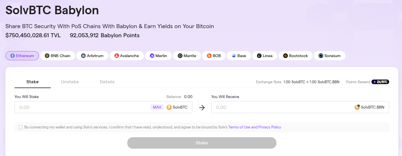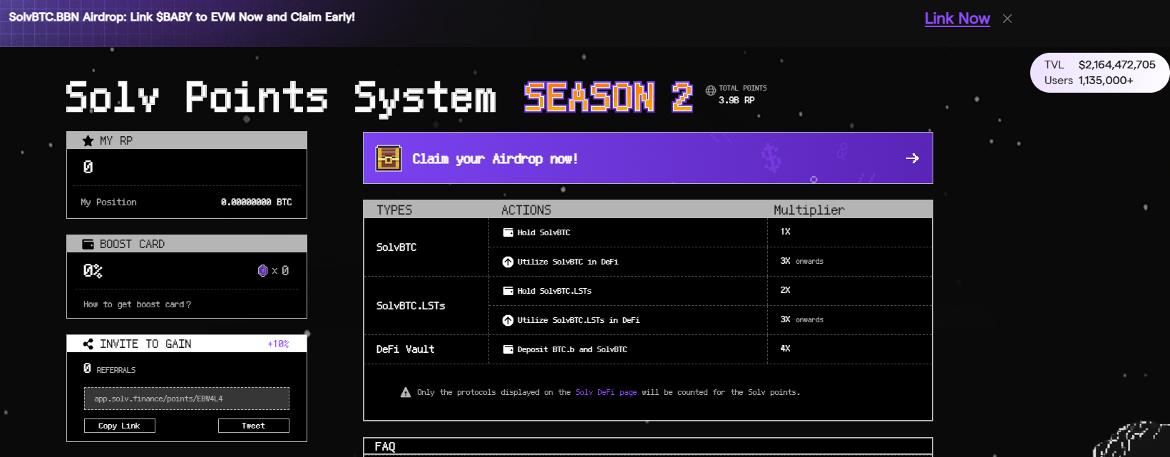 여기에 다시 SolvBTC를 리스테이킹해서 솔브 포인트 파밍해서 Babylon의 $BABY와 $SOLV 에어드랍까지 노려볼 수 있습니다.