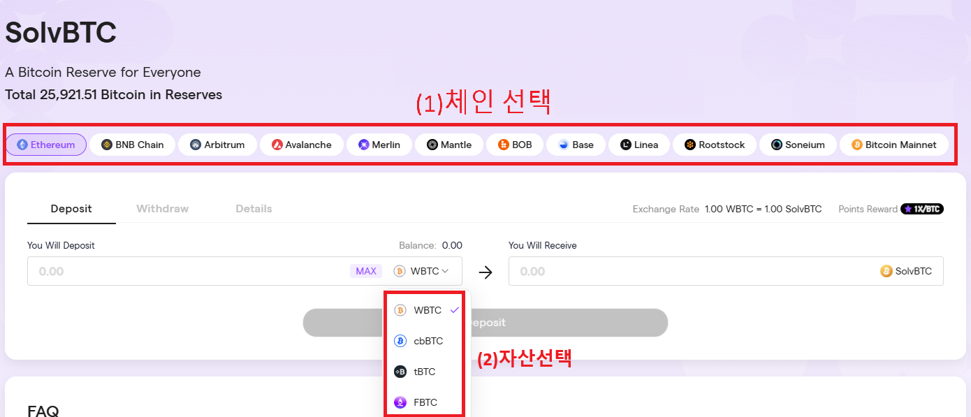 예치할 체인을 선택하고 자산을 선택한 후 Deposit 을 클릭하면 SolvBTC로 스왑이 가능함. 매우 쉽죠?