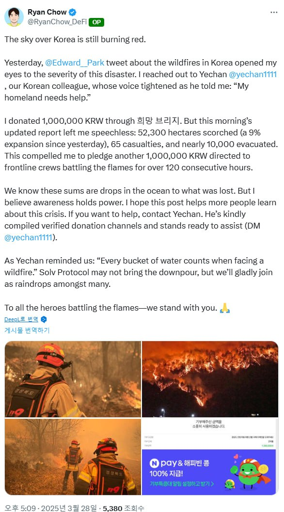 이번에 크게 산불이 났는데 산불피해에 지원까지.. 솔브 프로토콜은 한국에 관심을 많이 쏟고 있습니다. 아래에서 더 많은 소식과 이벤트를 알아보세요!