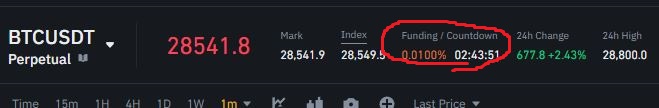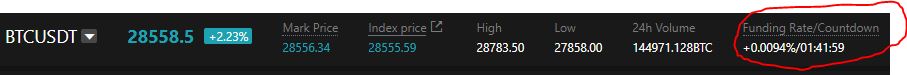 거래소가 산정하는 펀딩비는 현재 선물가격과 기초자산 현물가격의 차이에 따른 함수입니다. 위 사진을 보시면 현물가격이 선물가격과 0.01$ 약 1.5퍼센트 차이가납니다. 이러한 경우 펀딩비율이 커지는것을 볼 수있습니다.