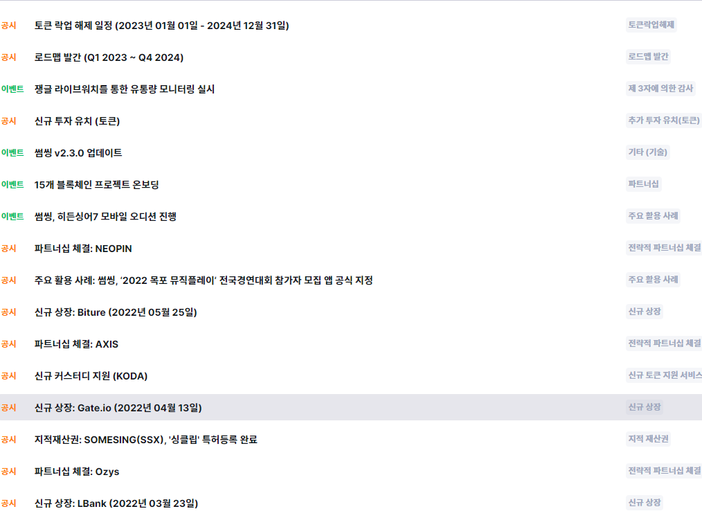 썸씽은 꾸준히 파트너십을 체결, 신규투자, 히든싱어7 모바일 오디션,특허권,신규상장 등등 호재로 보이는 내용이 꽤나 보이긴 하는데 당장 썸씽(SSX)의 가격에 눈에 띄는 변동을 줄만한 호재는 보이지 않고 있습니다.