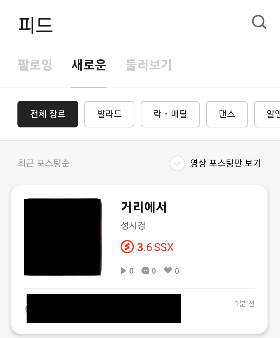 재 창작자들이 자신의 노래를 업로드를 하게되면 이런식으로 피드에 올라오게 됩니다. 이용자들은 자신의 취향에 맞는곡을 찾아들으며 후원을 할 수있습니다.