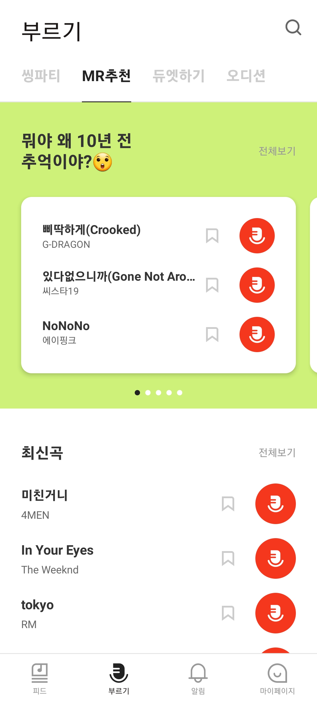 이용자들은 언제든지 부르기에 들어가 MR에 노래를 부르면 노래를 재창작할 수 있습니다.