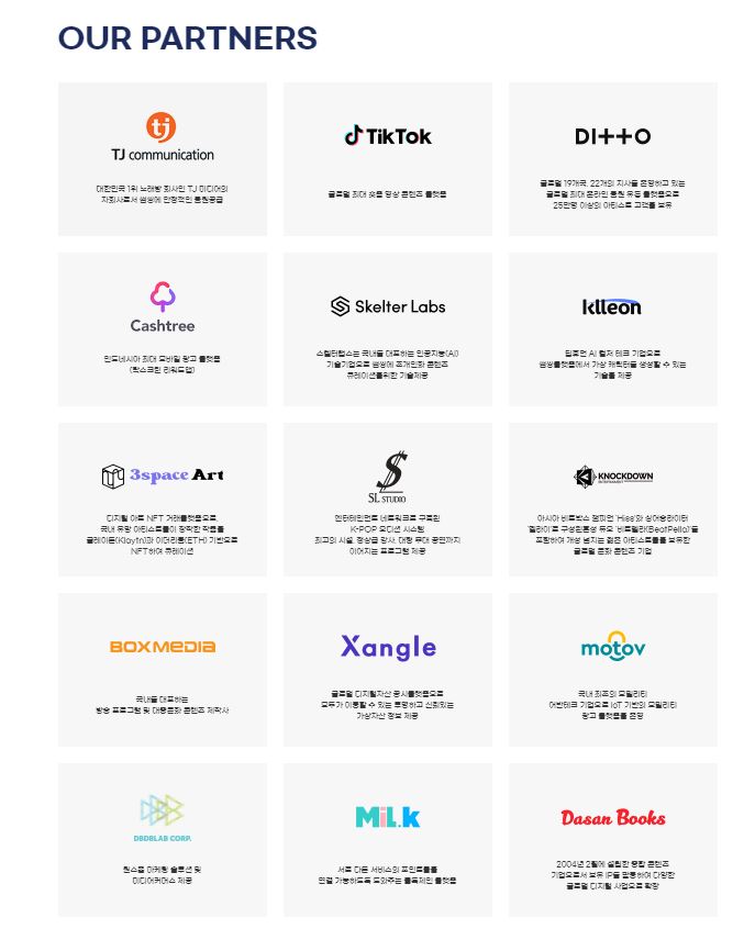 쭉 훑어보면 눈에 뛰는 파트너사들이 보입니다. 게다가 최근 나스닥 상장 관련해 유명했던 밀크와 파트너십이 체결되어 있습니다.