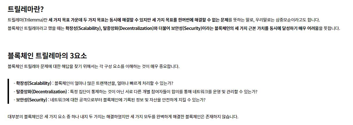결국 블록체인 트릴레마라는 문제가 발생하였습니다. 비트코인과 이더리움의 경우 탈중앙화와 보안성 문제를 해결하였다고 평가받고 있었지만 여전히 확장성 문제를 겪고 있습니다.