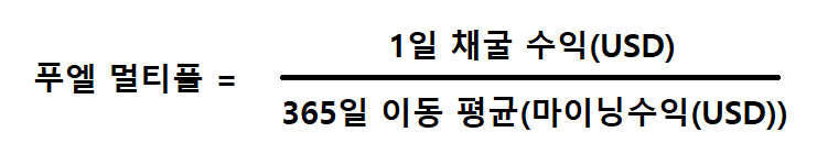 채굴자는 전기료와 유지비 등 채굴기를 운용하는데 있어 계속 일정한 비용을 지불하게 됩니다. 하지만 전기세 상승, 비트코인 가격 변동 등에 의하여 채굴 수익의 기대값이 변하게됩니다. 푸엘멀티플 지표는 365일 평균 예상수익을 단기수익과 비교합니다.