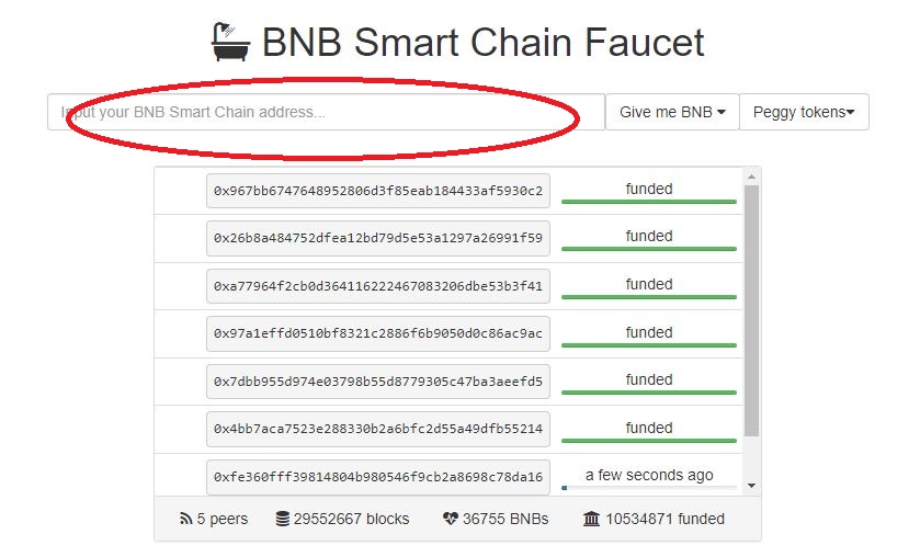 복사한 지갑 주소 클릭 후 GIVE me BNB - 0.1 BNB 클릭 Peggy Token으로 테스트용 다른 코인도 받기 가능