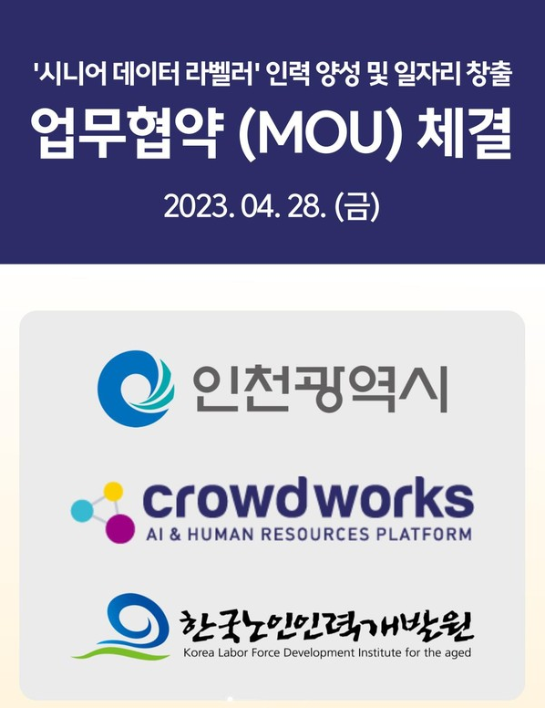 업무협약체결 지난 4월 28일 15시 크라우드웍스와 인천광역시, 한국노인인력개발원은 미래유망 직종인 ‘데이터 라벨러’ 노인일자리 창출을 위한 공동 협력을 위해 업무 협약을 체결했다고 밝혔습니다. ‘데이터 라벨러’는 디지털 전환 시대에 발맞춰, 인공지능(AI) 학습을 위해 필요한 데이터를 수집, 저장, 검증, 라벨링 등을 수행하는 사람으로, 지난해부터 ‘인공지능(AI) 학습데이터 구축’ 직무가 국가직무능력표준(NCS)에 정식 확정 되었습니다. 이번 협약으로 한국노인인력개발원은 사업을 총괄 관리하면서 취업알선형 수행기관 선정, 사업비(국비) 지원 등을 맡고 크라우드웍스는 서비스제공 플랫폼/어플리케이션플랫폼/애플리케이션 운영, 교육예산 지원, 양성인력 플랫폼/애플리케이션 활용정보 제공 역할을 담당합니다. 시는..